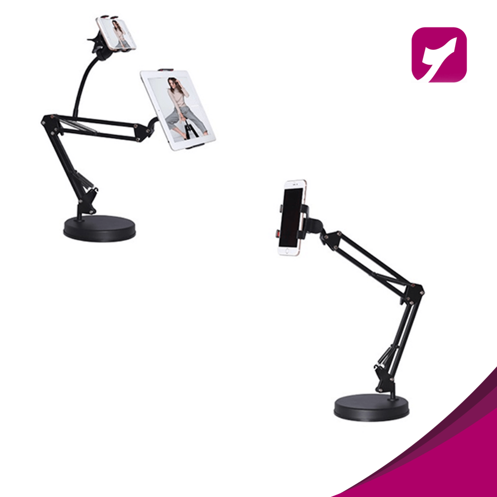 - حامل مزدوج لجهاز آيباد و هاتف ذكي: يتميز هذا الحامل المعدني بوجود ماسك للهاتف وماسك للآيباد ليسهل عليك حمل أجهزتك كلها في مكان واحد وبدون عناء التنقل بينهم باستمرار, فقط ثبتهم على الحامل واستمتع بسهولة العمل, يمكنك أيضًا حمل هاتفين بدل هاتف وآيباد
