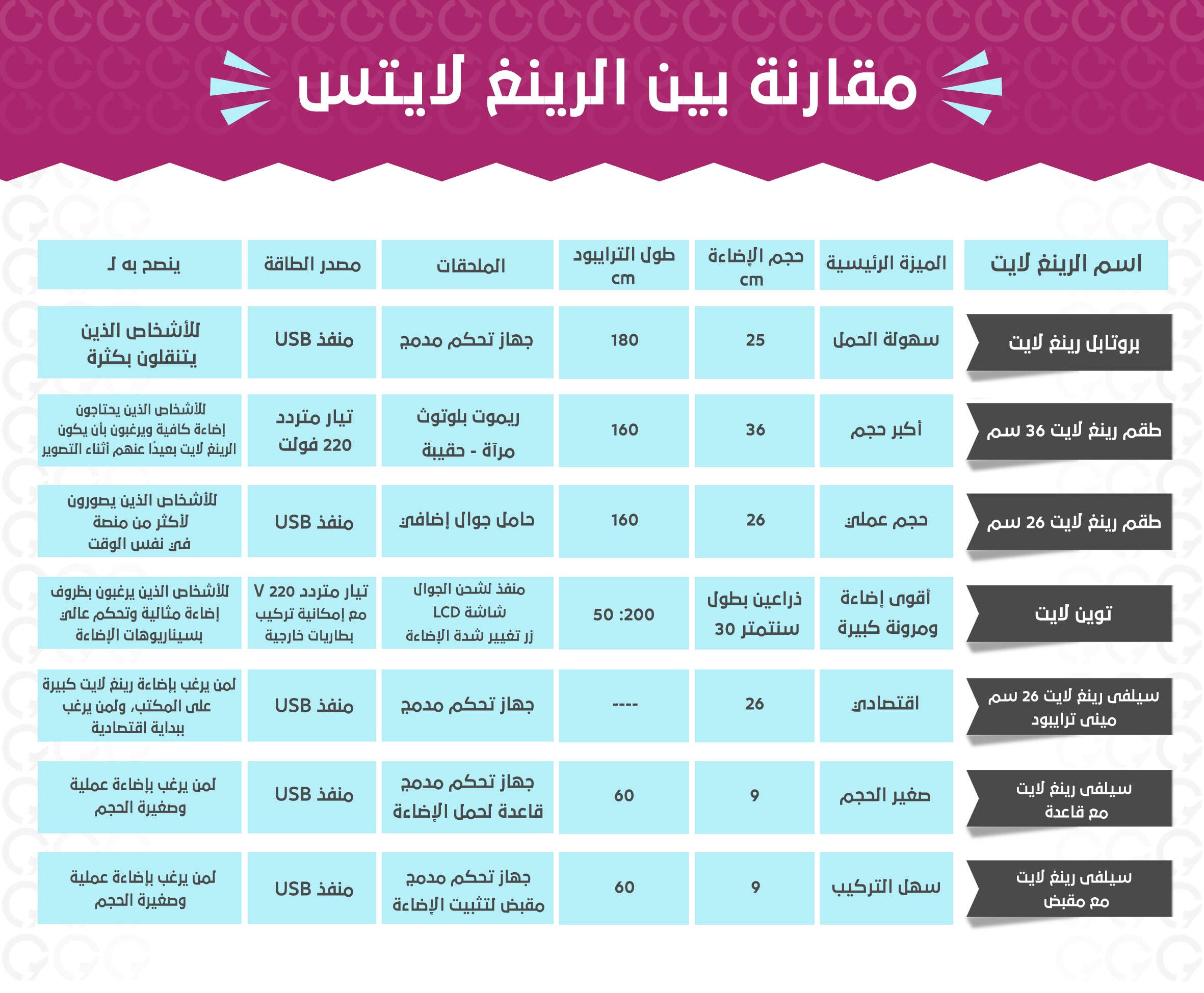 يمكنك التعرّف على تفاصيل أنواع الرينغ لايتس الأخرى من هنا : إضاءات للتصوير رينج لايت